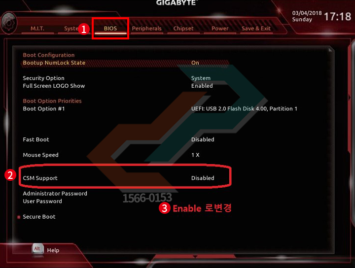 3. [CSM Support] 를 [Enabled] 로 변경하여 줍니다.