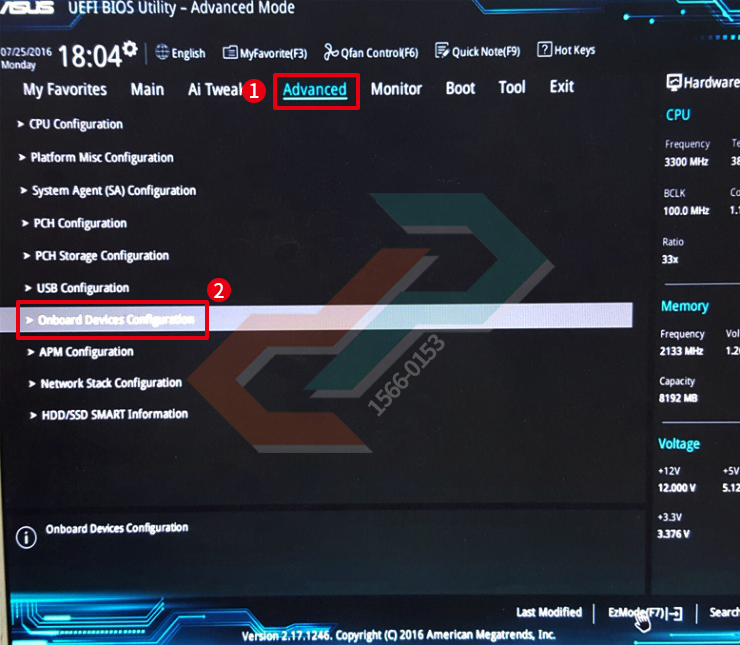 3. Advanced 중 7번째 메뉴인 Onboard Devices Configuration 에서 [Enter] 키를 누릅니다.