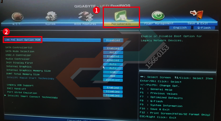 2. [Peripherals] 메뉴를 찾아 클릭한 뒤, LAN PXE Boot Option ROM 을 클릭합니다.